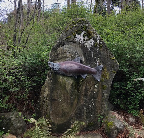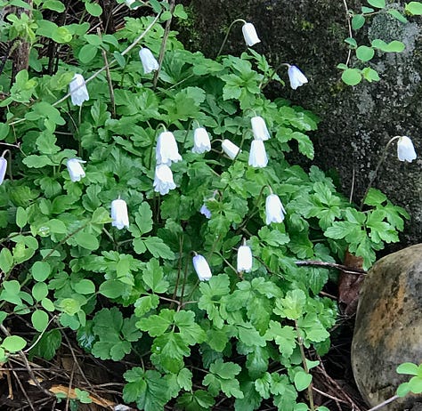Today, Nora’s Woods is a peaceful bit of native greenery in an increasingly developed city. Yesterday, on an early spring day, wildflowers were peeking out from amongst the ferns and Oregon grape. Pale sunlight and birdsong filtered through the trees. I can only imagine how inviting and cool this haven would be on a hot summer day.